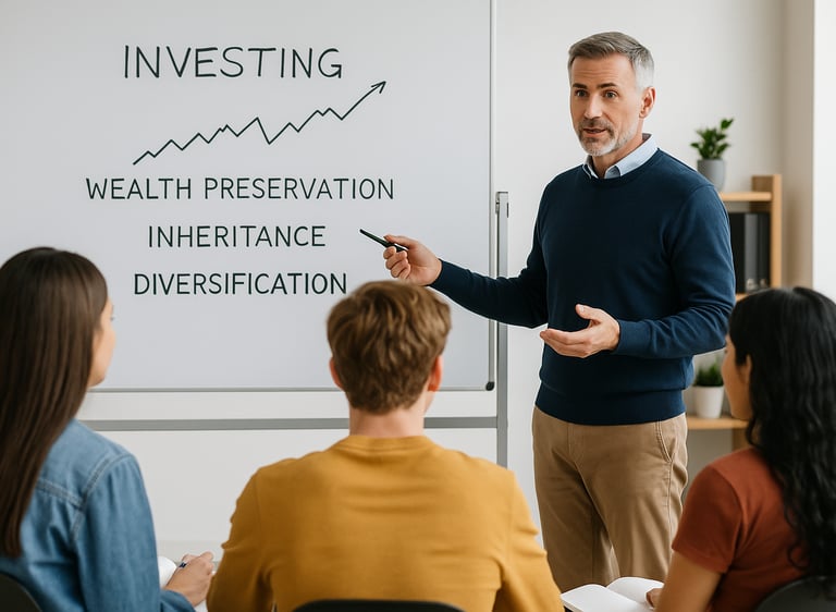 Programa de aulas voltadas para jovens e adultos: conceitos de investimento, preservação patrimonial, herança e diversificação. Com material gravado e sessões ao vivo para tirar dúvidas, individual ou em grupo. Orientamos os jovens para construir bases sólidas para um futuro financeiro.